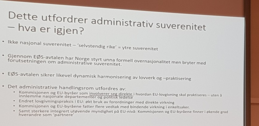 Han belyste situasjonen med å være tett knyttet til EU og samtidig uten politisk innflytelse. Derimot har vi endel administrativ innflytelse gjennom komiteer og samarbeid med ulike byråer.